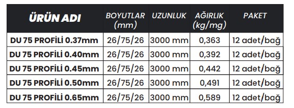 Duvar U 75 Profili, alçı levha bölme duvar yapımında kurulan metal konstrüksiyonda taşıyıcı görevi gören DC 75 profillerinin ve bölme duvarın terazide durmasını sağlayan taşıyıcı olmayan sıcak daldırma galvanizli çeliklerden üretilen profillerdir.